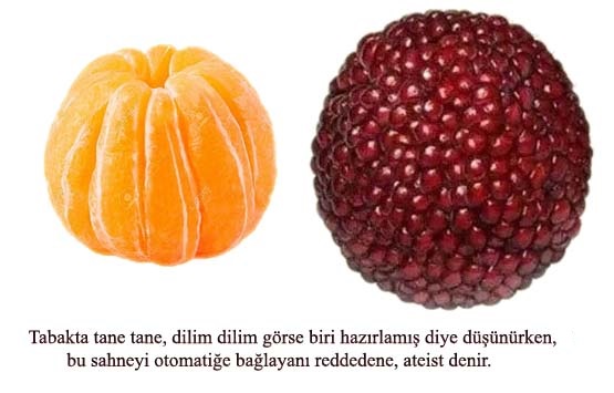 Çikolatayı çok seven biri gitse, çikolatanın fabrikasını incelese, birçok girdi, çıktı, elektrik, çöp, atık ile karşılaşacaktır. Onları göz ardı edip çikolatayı çok seven bu arkadaş, fabrikanın duvarına yapışsa, sarılsa, öpse ve “Sana teşekkür ederim, ne kadar güzel şeyler üretiyorsun!” dese, bunu görenler o kişi hakkında ne düşünürler acaba? “Bu adam zeka özürlü herhalde.” derler ve adamı ya tımarhaneye sokarlar ya da alaya alırlar. Aynı şey mandalina seven için de söz konusudur. Bu kişi de mandalina ağacına gidip onu gözlemlese, görecektir ki, fabrikanda karşılaşılan enerjiden çöpe hiçbir sorun bu ağaç için söz konusu değildir. Yıpranan parçalar direk geri dönüşüm mekanizmasında kullanıma hazır hale gelmektedir. Bu kişi ağaca yaklaşıp ona sarılsa ve “Sen ne kadar harika bir ağaçsın, ne güzel mandalinalar yapıyorsun, sana helal olsun.” dese, dışarıdan sizce bu sahne nasıl algılanır? Gerçekte mandalina ağacı akıl ve irade sahibi değildir, sadece kendisine kodlanan görevi yerine getirmektedir: Çamuru güneş ile birleştirip kendine kodlanan görev ne ise; mandalina tohumu/çipi çamuru mandalina, elma çipi aynı çamuru elma, limon çipi limon, biber çipi aynı çamuru bibere dönüştürür; ayrı renk, tat, koku, şekil, ambalajla! Asıl konumuza dönersek; çikolatayı beğenen binasına, tuğlasına değil sahibine teşekkür etmelidir. Mandalinayı beğenen de ağacına değil onun amirine (Yaradan’ına) teşekkür etmelidir. Tabiat ana yaratmaz, bahşetmez, hediye etmez! Doğa/toprak ana yoktur. Her ağaç, su, taş, hayvan; kısaca canlı cansız her ‘yaratılan’ bir araya gelerek kendilerine kodlanan görevleri yerine getirir. Bu görevleri o kadar uyumlu, dengeli ve ahenk içinde yerine getirirler ki, bazı basireti kapalı kişiler bu uyum ve dengeyi aşıp, kanunları koyan ve işleteni göremezler.