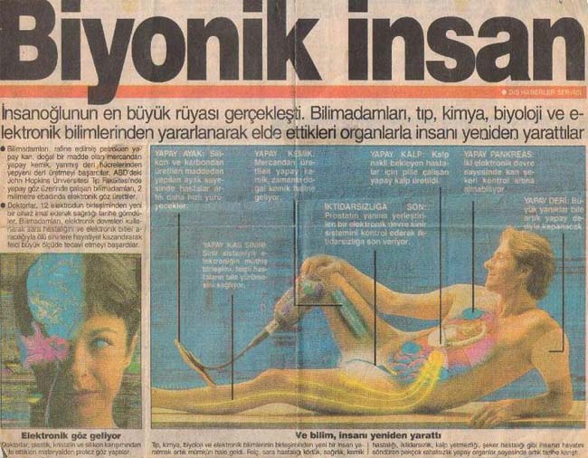 ‘Biyonik insan’ başlıklı diğer bir haber (Milliyet, 25.04.1999) ile devam edelim: “Bilim adamları, tıp, kimya, biyoloji, elektronik bilimlerinden yararlanarak elde ettikleri organlarla insanı yeniden yarattılar.” (Bu ve bundan sonra kitap boyunca delil olarak kullanacağımız ve birçoğu gazete-dergi kaynaklı resim-fotoğrafların asılları sitelerimizin ilgili sayfalarda bulunmakta olup, kitabın hacmini artırmamak amacıyla bu çalışmaya eklenmediğinin altını çizelim!) Aslında bu haber bize, ilk insan yaratılırken 'kullanılan' bilimlerden bazılarını da haber vermektedir. Biyonik insan için gazete ‘yarattı’ kelimesini kullanmaktadır. Peki, gerçeği kadar mükemmel olmasa da, bunların taklit edildiği orijinalleri için neden gazeteler ‘yaratılan’ ifadesini kullanmamakta ısrar etmekte ve bunları ‘Doğanın hediyesi, tabiatın yaratması’ olarak lanse etmektedir?! Taklidini insan yapınca adı ‘mucize-yaratma’ olurken aslını ‘Cebbar’ sıfatına sahip yüce bir varlık yapınca, yapan olarak neden “evrim, tabiat ana, doğa” gibi uyduruk tanrılar ilan edilmektedir acaba?