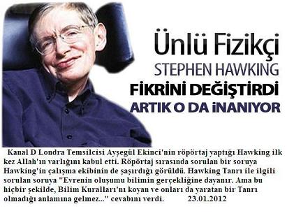 “En ünlü ateist: Artık Tanrı'ya inanıyorum. Dünyanın en tanınmış ateistlerinden (tanrı tanımaz) biri olan İngiliz Profesör Antony Flew, "Araştırmalar gösteriyor ki, hayatın varoluşunun ardında yüce bir varlık bulunuyor" diyerek Tanrı'ya inanmaya başladığını açıkladı.” (Gazete Vatan, 12.12.2004) Eski ateist Dr. Francis Collins: “Laboratuvarda Allah’ı hissettim.” Dünyanın en büyük genetik uzmanlarından biri olarak gösterilen ve insan DNA’sının şifresini çözerek büyük şöhret yakalayan Dr. Francis Collins: Allah’ın var olduğuna dair rasyonel bir temel var ve bilimsel gelişmeler insanı Allah’a daha da yaklaştırıyor.” (Timeturk, 09.04.2008) Kanal D Londra Temsilcisi Ayşegül Ekinci’nin konuştuğu ünlü fizikçi Stephan Hawking: “Evrenin oluşumu bilimin gerçekliğine dayanır. Ama bu hiçbir şekilde, bilim kurallarını koyan ve onları da yaratan bir Tanrı olmadığı anlamına gelmez.” (Star, 23.01.2012)