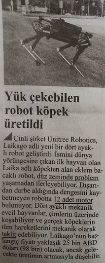 Çinli şirket Unitree Robotics, Laikago adlı yük çekebilen bir robot köpek üretir. “Düz zeminde” problem yaşamadan ilerleyen, 12 adet motoru olan ve gerçek köpeklerin tüm hareketlerini mekanik olarak “taklit” edebilen bu köpeğin fiyatı 25 bin dolardır. Daha sonra robot geliştirilir. (TRT Haber, 05.02.2022) Üzerindeki kamera sistemleriyle uzaktan görüş ve kontrol imkanı sağlanır. İki saatlik pil ömrü olan ve uzaktan kumanda ile kontrol edilebilen bu robot ile ilgili haber bizi her gün sokaklarda gördüğümüz bu canlıların aslında ne kadar mükemmel bir teknoloji ile ‘yaratıldığını’ anlamamıza da vesile olmakta değil midir?