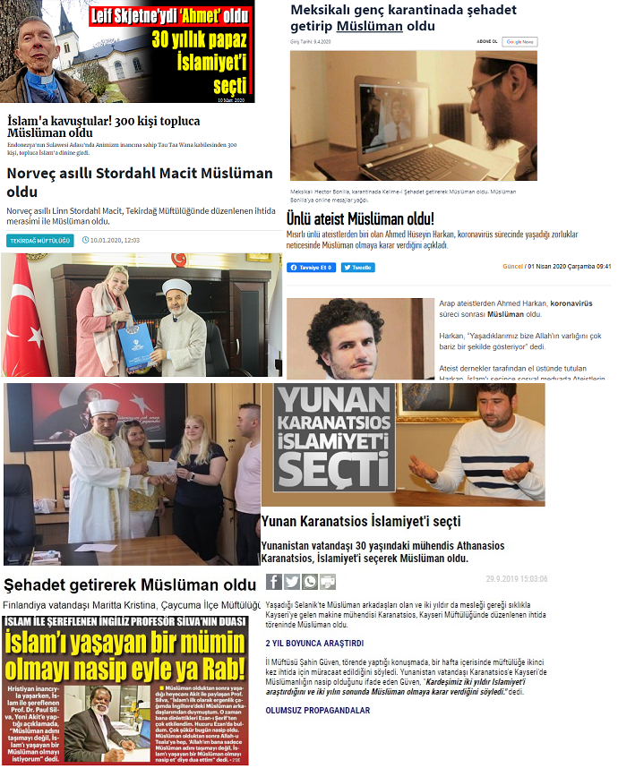 Ateist iken Müslüman olan Estonyalı Eslimah (23 Aralık 2018); Ateist iken Müslüman olan Fransız Leonard Faytre (3.10.2014) ve Ukrayna’lı olup sonradan Müslüman olan kadının sosyal medya mesajı: “Müslümanlar, İslam’ın ne olduğunu öğrenin.” (https://www.youtube.com/watch?v=Gs39NsFSFPI ; 21.2.2020)