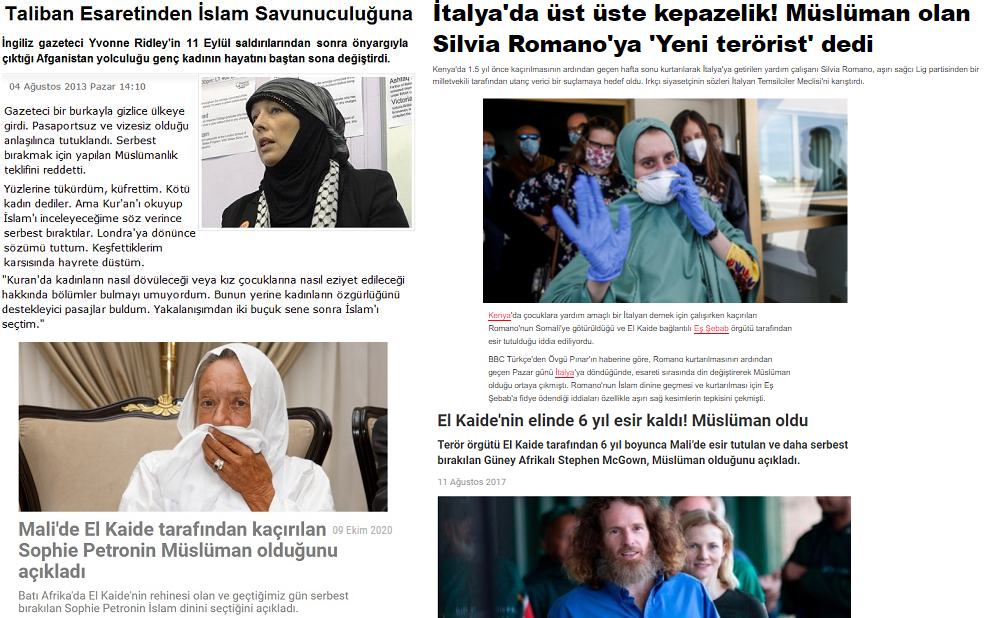 Taliban elinde esir iken sonradan Müslüman olan gazeteci Yvınne Ridley (4.8.2013); eş-Şebab tarafından kaçırılan ve daha sonra Müslüman olan yardım gönüllüsü Silvia Romano (12 Mayıs 2020); El-Kaide tarafından kaçırılan ve sonra Müslüman olan Sophie Petronin (9.10.2020); el-Kaide tarafından esir alınıp bırakılan ve Müslüman olan Stephen McGown (11.9.2017); Taliban elinde esir iken Müslüman olan ama buna Talibanı bile inandıramayıp bir güzel de dayak yiyen Avustralya’lı Timothy Weeks (1.2.2022)…En marjinal gruplar bile insanları etkileyebiliyorsa, bir de biz Müslümanlar gerçekten İslam'ı temsil edebilsek sonuç ne kadar farklı olurdu değil mi?!