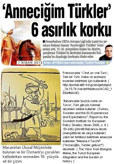 'Gerçek bir Türk' ('C'est un vrai Turc'): Kaba ve acımasız insanları betimlemek için kullanılan ırkçı bir Fransızca deyişi; İtalyancada "bestemmia come un Turco" ("Türk gibi küfretmek") ve "puzza come un Turco" ("Türk gibi pis kokmak") deyimi; Macaristan Ulusal Müzesinde bulunan ve bir Osmanlı'yı çocukları katlederken resmeden 16. yüzyıla ait bir çizim; İsrail, Batı Şeria'da cami duvarına ırkçı slogan, Belçika'da camiye saldırı, Fransa'da cami duvarına ırkçı yazı, Hollanda'da camiye molotoflu saldırı, Batı Trakya'da camiye taşlı saldırı, Avustralya’da cami arazisine haçlı, domuzlu saldırı gibi haberler aslında tarihten ders almadığımızı ve hiç birşeyin değişmediğinin göstergelerini oluşturmaktadır. Detayı, “İslamofobi” ve “Batı medeniyeti” adlı yazılarımızda.