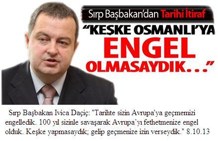 Tarihi Osmanlı itirafı: 'Keşke yapmasaydık' Sırbistan ile Osmanlı arasında yaşanan savaşları hatırlatan Sırbistan Başbakanı Daçiç, '100 yıl sizinle savaşarak Avrupa'yı fethetmenizi engelledik. Keşke yapmasaydık' dedi. (Star, 10 Ekim 2013)