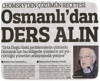Osmanlı'dan ders alın. Chomsky, Orta Doğu'da yaşanan problemlerin çözümünde Osmanlı'nın bu bölgede yüzlerce yıl yürüttüğü yönetim anlayışında yattığını söyledi. (Türkiye, 01.10. 2013)