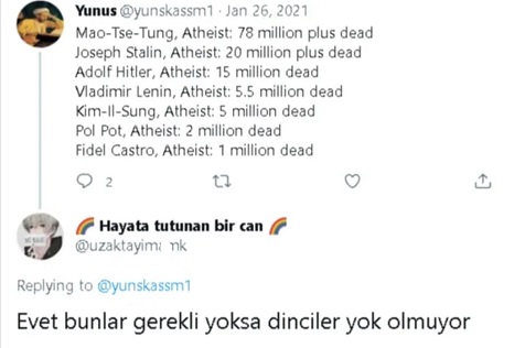 “Yeni ateistler şiddetin en büyük kaynağının din olduğunu söyleyebilmişlerdir. Sosyal adaletin yok sayıldığı dünyada şiddetin öfkenin olması değil olmaması sürpriz olur. İçinde bulunduğumuz düzen, İslam öncesi Arap coğrafyasında cahiliye olarak tanımlanan toplum yapısı ile bazı yönlerden paralellik arz etmektedir. Dünyanın süper güçleri, Orta Doğu petrolünü ele geçirmek için bu ülkeler üzerinde türlü oyunlara başvurmaları, sebep oldukları yıkım ve sömürülerden kaynaklanan çatışmaların sorumluluğunu, sömürdükleri ülke insanlarının omuzlarına yüklemektedir. Terörist nitelemesi, gücü elinde bulunduran devletlerin kendi ideolojik amaçlarına karşı çıkan muhaliflerine yaptıkları bir yakıştırma olarak kabul edilmiştir.” (Emine Öğük, Yeni ateistlerin yanılgıları, s. 111, 117-119) “Stalin ve Mussolin, Hitler gibi din düşmanı kişiler yüzünden 70 milyondan fazla insanın katledilmesini ve doğanın tahrip edilmesini hiç konuşmuyorlar. Ateistler, komünist ülkelerin neredeyse tamamının neden baskıcı birer diktatörlüğe dönüştüğünü izah edemiyorlar. Dünyanın en kanlı savaşı olan II. Dünya Savaşı'nın aktörleri ya ateist ya da dindar olmayan kişilerdi. Demek ki dinler devre dışı bırakıldığında insanlık daha iyiye gitmiyor, kurdukları bütün ideolojiler başarısız oldukça hırçınlaşıyorlar.” (Prof. Cafer Karadaş, Ateist ve deistlere cevap, s. 57, 59) "Din kaynaklı bilinen savaşlar dine değil başka çıkar ve menfaatlere dayalı olarak ortaya çıkmıştır. Savaşlar daha ziyade çıkar güç devşirme gibi niyetlere niyetlerle ortaya çıkar." (Emine Öğük, Yeni ateistlerin yanılgıları, s. 31, 116)