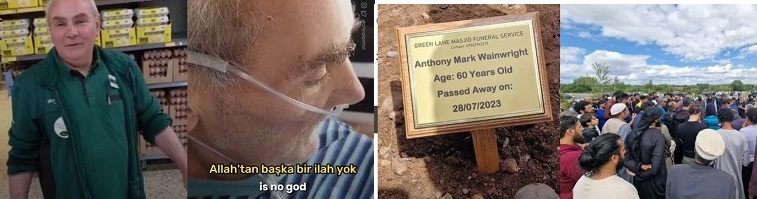 İngiltere'de, kanser tedavisi gördüğü sırada kendisiyle ilgilenen Müslümanların vesilesiyle İslamiyet'le tanışan ve şehadet getirerek İslam'la şereflenen Anthony Mark Wainwright isimli adam, şehadetinden 24 saat sonra vefat etti. Ailesi olmadığı ifade edilen İngiliz adamın, henüz yeni tanıştığı Müslüman arkadaşları tarafından defnedildiği kaydedildi. (01.08.2023) Merhum Anthony Mark Wainwright hem İslam'ın kılıçla yayılmadığını ve Müslümanların İslam'ı yaymadaki amaçlarının ganimet ve dünyalık olmadığını gösterdi hem de 'Şu kişi Müslüman değil ama iyi biri, o şimdi cehenneme mi gidecek?' diyenlere bir günlük Müslümanlığı ile cevap verdi. Tıpkı 1913 doğumlu Fransız Komünist Partisi genel sekreteri iken ve 80 öncesi sol hakkındaki kitapları Türkçeye çevrilen Roger Garaudy'nin 70 yaşında Müslüman olup İslam hakkında pek çok eser yazması gibi. Mekanları cennet olsun!