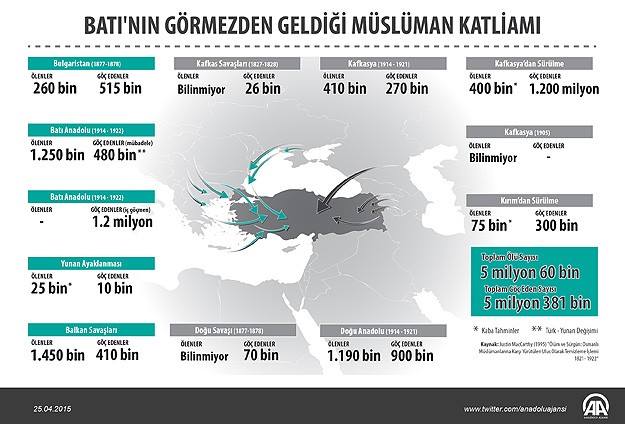 Batı'nın görmezden geldiği Müslüman katliamı: Ermenilerin 1915 olaylarına ilişkin iddialarını birçok vesileyle gündeme getiren Batı ülkeleri, Osmanlı Devleti'nin son döneminde Balkanlar ve Kafkasya başta olmak üzere geniş bir coğrafyadan Anadolu'ya dönmek zorunda bırakılan ve katledilen milyonlarca Müslümanın acısını çifte standartlı bir yaklaşımla görmezden geliyor. ABD'nin Louisville Üniversitesi'nde çalışmalarını sürdüren tarihçi ve nüfus bilimci Justin McCarthy, 1995'te yayınlanan "Ölüm ve Sürgün: Osmanlı Müslümanlarına Karşı Yürütülen Ulus Olarak Temizleme İşlemi" adlı kitabı, 1821-1922 yıllarında Balkanlar, Kafkasya, Kırım ve Anadolu'da yaşanan Müslüman halkların uğradığı katliamlara ve sürgüne ışık tutuyor. McCarthy, kitapta 1800'lerin başında Osmanlı Devleti sınırları içinde kalan Anadolu, Kırım ve art bölgeleri, Kafkasya'nın büyük bölümü, Arnavutluk ve Bosna'dan Karadeniz'e uzanan çizgide Güneydoğu Avrupa'nın tümünü kapsayan bir coğrafyada Müslümanların, bazı bölgelerde çoğunluk bazı bölgelerde azınlık olarak yaşadığına dikkati çekiyor. Osmanlı Devleti'nin zayıflayarak dağılma sürecine girmesiyle bu bölgelerde Müslüman nüfusun topraklarından çıkarıldığını ya da katledildiğini kaleme alan McCarthy, 1821-1922 yıllarında 5 milyondan fazla Müslümanın öldürüldüğünü, sürgün edilen ya da göç etmek zorunda kalan Müslümanların bir kısmının, yolllarda açlık ve hastalıktan yaşamını yitirdiğini vurguluyor. Öte yandan Balkanlar'da, Kafkasya'da ve Anadolu'daki Müslümanların uğradığı katliamının tarihçesiyle ilgili Batı ülkelerinde herhangi bir yayına rastlanmıyor, kayıplar ders ve tarih kitaplarında yer almıyor. Justin McCarthy'nin kitabında, Batı Trakya'daki Türklerin, Yunanlara ait bağımsız bir Yunanistan yaratma amacına engel olarak görüldüğü için 1800'lerin başında silahlı milliyetçi grubun hedefi olduğu, 1821'de, köy ve kasabalarda yaşayan Türklerin, yerleşim merkezlerinin dışına götürülüp kıyımdan geçirildiği ve bu süreçte 25 binden fazla Batı Trakya Türkünün öldürüldüğü belirtiliyor. McCarthy'nin kitabına göre, 19. yüzyılın başında bölgedeki Ruslaştırma politikası çerçevesinde Nogay ve Kırım Tatarlarına iki seçenek sunuldu: Ya Rusya’nın iç bölgelerine sürgün ya da Osmanlı'ya göç. Kitapta, Nogay Tatarlarının göçünün 1860'lı yıllar boyunca sürdüğüne, en az 300 bin Tatarın, topraklarından ayrılarak göç etmek zorunda kaldığına, yine 19. yüzyılda Kafkasya ve Osmanlı'nın doğu illerindeki dengenin, Rus istilaları, Ermeni ayaklanmaları ve Kafkasyalı Müslümanların zorla göç ettirilmeleri nedeniyle altüst olduğuna dikkat çekiliyor. Rus istilasından önce, Kafkasya'daki Müslüman halk, Azerbaycan-Erivan bölgesindeki Türklerden ve bölgenin geri kalanındaki Çerkezler, Abazalar, Çeçen-İnguşlar ve Dağıstanlılar gibi diğer gruplardan oluşurken, 1864'te Rusların Kafkasya'da kontrolü ele geçirmesiyle bölgedeki Müslümanların göçe zorlandığı belirtilen kitapta, yurtlarını terk etmeye zorlanan Müslüman Çerkezlerin ve diğer Kafkasya halklarının, Rus denetimindeki limanlarda gemilere doldurulduğu, Osmanlı topraklarına ulaşıldığında ilk uğranılan liman olan Trabzon'da, hastalık ve yetersiz beslenmeden hayatını kaybedenlerin sayısının 30 bini bulduğu ifade ediliyor. Justin McCarthy, Osmanlı Devleti'nin doğu vilayetlerinde ve Kafkasya'da 1877-1914 yılları arasında yaşanan katliamlarla, Müslümanların yurtlarının Ruslar tarafından zapt edildiğini, Ruslardan kalan topraklara da ayrılıkçı Ermeniler tarafından el konulmaya çalışıldığını gözler önüne seriyor. McCarthy, kitabında, Doğu Anadolu'da Müslümanlar ve Ermeniler arasındaki savaşta, Van vilayetindeki Müslümanların yüzde 62'sinin, Bitlis Müslümanlarının yüzde 42'sinin, Erzurum Müslümanlarının da yüzde 31'i yok olduğunu vurguluyor. Tarihçi ve nüfus bilimci Justin McCarthy, 1877-1878 yıllarında yaşanan Rus-Türk Savaşı'nın Bulgaristan'da yaşayan Türkler için bir felakete dönüştüğünü, Bulgar ve Rus birliklerinin katliamları, açlık, hastalık ve göçmenlerin yerleştirildiği kamplardaki koşullar nedeniyle ölümlerin yaşandığını ifade ediyor. Kitapta, Bulgaristan'daki Türk varlığına tümüyle son vermek isteyen Rusların, bölgeden göç etmek zorunda kalan Türklerin evlerini yakarak, geri dönmelerini engellemek üzere Bulgarlarla işbirliği yaptığının, 1911 yılına gelindiğinde Balkanlar'daki nüfus dağılımının tümüyle değiştiğinin, Balkan Savaşları sırasında yaşanılan kayıplarla birlikte, Müslümanların, Balkanlar'da çoğunluk olma vasfını kaybettiğinin altı çiziliyor. McCarthy'nin kitabında, 15 Mayıs 1919 tarihinde Batı Anadolu'da yaşanan Yunan işgali sırasında, İzmir'e yapılan çıkarmayla kitlesel bir Türk kıyımına başlandığı vurgulanıyor. Müslümanların, o dönemde Batı Anadolu nüfusunun yüzde 80'ini oluşturduğu, işgal sırasında Türk köylerinin, yerleşim merkezlerinin yakılıp yıkıldığı, 1912'den İstiklal Harbi'nin sonu olan 1922'ye kadar Batı Anadolu'da bir milyon 246 bin 68 Müslümanın hayatını kaybettiği belirtilen kitapta, bu savaşlar sona erdiğinde Balkanlarda yaşayan kalabalık Türk nüfusunun epey azaldığı, Kafkasya'da Çerkezlerin, Lazların, Abazaların, Türklerin ve daha küçük Müslüman toplulukların yurtlarından sürülüp çıkarıldığı anlatılıyor. Kitapta, Sırbistan'dan Kafkasya'ya uzanan bölgede birçok ulus devlette sağlanan etnik ve dini birliğin, Müslümanların bu topraklardan sürülmesiyle sağlandığına dikkati çeken McCarthy, tarih kitaplarının çoğunda, azınlıklara duyulan nefret üzerinden bir okumayla yal