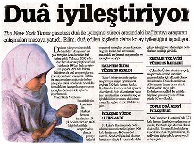 Dua okutmak hastalıklara daha iyi geliyor: Kansas st. Luke’s hastanesi, San Francisco hastanesi ve Columbia üniversitesinin yaptığı araştırmalar, dua okutmaların -dikkat okumanın değil!- hastaların iyileşme sürecini hızlandırdığını ortaya çıkardı. Hastalar kendileri için dua edildiğini bilmiyorlardı. St. Luke’s Hastanesinde kendisine dua edilen 990 kalp hastasının 466’sına dua okundu. Dua okunan hastaların yüzde 11’i daha hızlı iyileşti. San Francisko Hastanesinde 390 hastadan 150’sine dua edildi ve bu hastalarda daha çabuk iyileşti. Columbia Üniversitesinde üreme sorunu yaşayanlardan dua okunanalarda, döllenme başarısı oranı yüzde 8’den 16’ya çıktı. Embriyonun rahimde sağlıklı büyüme şansı ise yüzde 25’ten 50’ye yükseldi. İngiltere Ulusal Psikiyatri Enstitüsü’nün uzmanı Dr. Peter Fenwick’e göre bu araştırmalar insan enerjisinin gücüne işaret ediyor. (Vatan, 12.09.2003); Nörolog Andrew Newberg'in araştırma sonuçlarını yayınladığı “How God Changes Your Brain” (Tanrı beynimizi nasıl değiştiriyor?) adlı kitaptan: “ 10-15 dakika içten şekilde dua etmek beynin gri bölgelerini harekete geçiriyor, düşünce gücünü artırıyor ve merhamet duygusunu geliştiriyor. Korku ve öfke gibi duyguları azaltıyor. Bu etkilerin sonucu olarak öğrenme yeteneği gelişirken, oluşan rahatlama hisside psikolojik açıdan sağlık üzerinde olumlu etkiler yaratıyor.”; Atatürk Üniversitesi Tıp Fakültesi Psikiyatri Anabilim Dalı Öğretim Üyesi Prof. Dr. Nazan Aydın: “Dua, zikir gibi dini yaşantılar sırasında beynin bazı bölgelerinde kanlanma artıyor ve uzun süre devam ettirildiğinde ise beynin hafıza ve dikkatten sorumlu bölgelerinde yeni beyin hücresi oluşumu meydana geliyor.” (Yeni Asya, 18 Nisan 2010); ABD"de yayınlanan ünlü haber dergisi, Allah ve Sağlık: Din İyi Bir İlaç mı? Bilim Neden İnanmaya Başlıyor? (God & Health: Is Religion Good Medicine? Why Science is Starting to Believe?) başlığı altında dinin iyileştirici etkisini kapak konusu yaptı. Allah inancının insanın moralini yükseltip hastalıktan daha kolay kurtulmasını sağladığına değinilen makalede, bilimin de inançlı insanların hastalıkları daha kolay ve çabuk atlattığına inanmaya başladığını bildirdi. Newsweek"in anketine göre, insanların %72"si dua ederek hastalıktan daha çabuk kurtulduklarına, duanın iyileşmeyi kolaylaştırdığına inanmaktadırlar. ABD ve İngiltere"de yapılan araştırmalarda da, hastalar için dua etmenin, hastaların rahatsızlık belirtilerini azalttığı ve iyileşme sürecini hızlandırdığı sonucu elde edilmiştir. (Newsweek, 10 Kasım 2003); Dua iyileştiriyor: The New York Times gazetesi dua ile iyileşme süreci arasındaki bağlantıyı araştıran çalışmaları masaya yatırdı. Bilim, dua edilen kişilerin daha kolay iyileştiğini ispatlıyor. (Yeni Asya, 12.10.2004); Yazar ve ressam Özge Günaydın kanserle mücadelesini kazanan ve bu süreci satırlara taşıyan bir kadın. “Çok dua ettim ve Rabbime sığındım. Bu hastalıktan ders çıkarmak için var gücümle uğraştım. Duanın gücüne inandım. Dua ederken çok daha fazla pozitif düşünceye odaklandığımı fark ettim. Dua benim için müthiş bir enerji kaynağıdır.” (Yeni Şafak, 18.3.2018); Dünyaca ünlü kalp cerrahımız Mehmet Öz diyor ki: “Dua etmek insanı çabuk iyileştirir. Her ameliyattan sonra hastalarıma dua ettiririm. Bu onları çabuk iyileştirir.” (Vatan, 4 Mart 2003); "Dua, bazen infilak gibi güçlü bir etkiye sahiptir. Bu yolla, kanser, böbrek iltihapları, ülser, deri, akciğer ve kemik veremi veya kalp zarı gibi hastalıkların hızla iyileştikleri görülmüştür. Başkası için yapılan dua, bireyin kendisi için yaptığı duadan sürekli daha etkili olagelmiştir. Öyle anlaşılıyor ki duanın kabulü, şiddet, ısrar, keyfiyet ve kalitesine bağlıdır." (Alexis Carrel, Dua, s. 62 ); “Dua yer çekimi gibi gerçek bir kuvvettir. Doktorluk hayatımda tıbbın fayda etmediği ama dua ile iyileşen nice insanlar gördüm. Bu alt edilemez sanılan tabiat kuralları ile başa çıkacak tek kuvvet duadır.” (Carrel, Bütün Dünya Dergisi, Ağustos, 1949)
