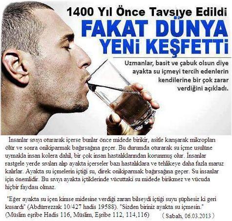 Ayakta su içmenin zararları. Uzmanlar, ayakta su içmenin tıbbi zararlarını sıraladı. Ayakta su içmenin insanlara tıbben zarar verebileceğini belirten uzmanlar, "İnsanların mideleri pozisyonlarına göre farklılık gösterir. Yani ayakta ve oturur vaziyetteki midenin pozisyonu farklıdır. Ayakta duran bir insanlar eğer sıvı gıda içerse doğrudan doğruya onikiparmak bağırsağına geçer. Bu da midenin küçük eğriliğine uyan kısmında Waldeyerin mide caddesi denen oluk bulunur. Sıvı gıdalar bu yolu takip ederek devamlı küçük bir açıklığı olan mide çıkışını geçerek onikiparmak bağırsağına geçer. Yani şöyle diyecek olursak insanların ayakta su içmeleri sonucunda suyu içerler ve hiçbir yere etkisi olmadan direk onikiparmak bağırsağına geçer. Su insanlar için önemlidir. Bu sıvıyı ayakta içtiklerinde vücuttaki su midede birikmez ve vücuda hiçbir faydası olmaz. Eğer insanlar sıvıyı oturarak içerse bunlar önce midede birikir, asitle karışarak mikropları ölür ve sonra onikiparmak bağırsağına geçer. Bu durumda oturarak su içme usulüne uymakla insan kolera dahil, bir çok insan hastalıklarından korunmuş olur. İnsanlar rastgele yerde sıvıları alıp ayakta içerseler bazı hastalıklara ve tehlikeye daha fazla maruz kalırlar." dedi. (Sabah, 6.3.2013); "Eğer ayakta su içen kimse midesine verdiği zararı bilseydi içtiği suyu şüphesiz ki geri kusardı" (Abdürrezzak 10/427, hadis, 19588); "Sizden biriniz ayakta su içmesin. Her kim unutur da içerse kusmaya çalışsın" (Müslim, Eşribe, Hadis 116); Resûli Ekrem sallallahu aleyhi ve sellem "Ayakta su içmeyi yasaklamıştır" ifadesi, Müslimin bir başka rivayetinde "Ayakta su içmekten men etmiştir" şeklinde geçmektedir. (Müslim, Eşribe, 112, 114); "Hiçbiriniz ayakta su içmesin." (Müslim, Eşribe 116)