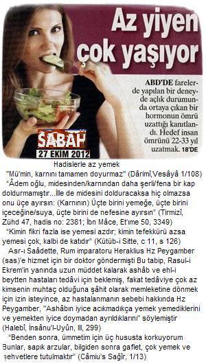Az ye, sağlıklı ve uzun yaşa: Normalden daha az yemenin kanserden katarakta kadar pek çok hastalığı önlediği ortaya çıkarken yaşamı üçte bir oranında uzattığı da kanıtlandı. ABD'deki Ulusal Yaşlanma Enstitüsü'nde bilim insanları, 10 yıldan uzun bir süre 60 erkek ve 60 dişi maymundan oluşan iki grup üzerinde çalışma yaptı. ( Sabah, 27.12.2012; 13.10.2013); “Üç huy Allah’ın gazabını gerektirir. Acıkmadan yemek yemek, uykusuz kalmadan uyumak, lüzumsuz yere gülmek.” (Ramuze’l-Ehâdis, I/3340); “Birçok hastalığın gerçek sebebi çok yemedir.” (Câmiüs Sağîr, 1/36); Asr-ı Saâdette, Hareklius Hz. Peygamber aleyhisselam’a hizmet için bir doktor göndermişti. Bu tabip, Resul-i Ekrem’in yanında uzun müddet kalarak ashâb ve ehl-i beytten hastaları tedâvi için beklemiş, fakat tedâviye çok az kimsenin muhtaç olduğuna şâhit olarak memleketine dönmek için izin isteyince, az hastalanmanın sebebi hakkında Hz. Peygamber, “Ashâbın iyice acıkmadıkça yemek yemediklerini ve yemekten iyice doymadan ayrıldıklarını” söylemiştir. (Milaslı İsmail Hakkı, Tıbb-ı Nebevî, s. 22); "Mümin karnını tamamen doyurmaz" (Darimi, Vesâyâ, I/108); "İnsana, yaşaması için birkaç lokma yeter. Çok yemek isteyen, karnının yani midesinin üçte birini yemekle doldursun, üçte birini suya ayırsın, üçte birini de rahat nefes alması için boş bıraksın." (İbn Mace, Et'ime, 50); "Ademoğlu, karnından daha şerli bir kap doldurmamıştır."(Tirmizi, Zühd, 47); “Mide hastalıkların evidir. Tedavinin özü ise perhizdir.” (Ebû Dâvud, Tıb, 13); “Ümmetim hakkında en çok şu hususlardan korkuyorum: Şişmanlık, uykuya düşkünlük, tembellik ve iman zayıflığı!” (Suyûtî, Câmiu’s-Sağîr Tercümesi, Hadis No: 295); “Sizin Allâh’a en sevimli olanınız, az yiyip içen ve bedence hafif olanınızdır.” (Suyûtî, Câmiu’s-Sağîr Tercümesi, Hadis No: 221)