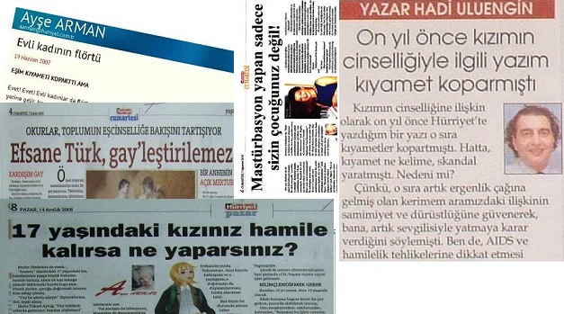 “Kadınlar için giyinir, erkekler için soyunurum.” (Ayşe Arman, Hürriyet, 20 Haziran 2012) "Boğaziçi Üniversitesinde okuyanlar bilir. Öğrenci işleri müdürümüz vardı, Metin B. Güzel kızlara düşkündü. Bizlerde krediye ihtiyacımız olunca, ders bırakmak-ilave etmek istersek "File çorap çeker, hafif dekolte yapar, ayakkabıları da eçirdiğimiz gibi alırdık soluğu Metin Hoca'da. Biraz da flörtöz konuştunuz mu işiniz halloldu demekti." (Sabah, 04.10.2003) Bir zamanlar 'yatak altına' gizlenen, hatta insanları utandıran "porno" artık günlük yaşamın göz önünde yaşanan sıradan bir parçası haline geldi. Özellikle de görselliğin ön plana çıktığı işlerde cinsellik prim yapıyor. Doğal olarak bunu kullanan insanların sayısı da giderek artıyor. (Hürriyet, 04.06.2007) Adli tıp uzmanı Prof. Sevil Atasoy, babalık testi için başvuran 4 babadan biri kuşkusunda haklı çıkıyor. (Milliyet, 8 Temmuz 2007) Tecavüz şurubunun düşmanı içki dedektifi: Bir kadına tecavüz ettiğini gösteren kayıtlar, akıllara 'tecavüz şurubu'nu getirdi. İçeceğe karıştırılan ve hafıza kaybıyla vajina kayganlığı sağlayan .. isimli ilaç, 'içki dedektifi' denilen bir tür aparat sayesinde teşhis edilebiliyor. Bu kartonlar yurtdışında ‘barlarda’ kullanılıyor. (Sabah, 03.09.2005) Okullarda taciz oranı yüzde 92: Çeşitli illerdeki 1136 ilköğretim öğrencisiyle yapılan anketten: Ankete katılan öğrencilerin yüzde 47’si sözlü, yüzde 26’sı fiziksel, yüzde 27’si ise cinsel tacize uğradığını belirtti. (Hürriyet, 24.08.2005) Ürküten akım: Annesinin Lolitası: Anneler 'Anasının kuzusu, annesinin bir tanesi' diye severlerdi evlatlarını. Ama durum değişiyor. Anneler küçük kızlarını Lolita'ya dönüştürmek için yarışıyor. Dünyada yayılan bu ürkütücü akım artık Türkiye'de de görülüyor. (Hürriyet, 21 Ekim 2014) Tecavüzden nasıl korunulur? Boğaziçi üniversitesi rehberlik ve psikolojik danışmanlık araştırma ve uygulama merkezi, kadınlar için "tecavüzden nasıl korunulur" rehberi hazırladı. Kadınlar en çok tanıdık erkeklerin tecavüzüne uğruyor. Bir kişiyi ırkı, dış görünümü, sosyal konumu ve sizinle olan ilişkisiyle değil, davranışlarıyla değerlendirin. ‘Sınırlarınızı belirleyin.’ Karşınızdakiyle ne kadar bedensel yakınlık kurmak istediğinizi belirleyin; ‘el sıkışma’ yanaktan öpme, dudaktan öpme, sarılma, vb. (Milliyet, 21.02.2005) “Doğum kontrol hapını kızına elleriyle içirtti: Aygen T.’ İkinci eşimin ilk eşinden olan kızı, 13'üne bastığında annesi kendi jinekologundan randevu aldı ve kızı için doğum kontrol hapı reçetesi istedi. Sonra da kızını karşısına alarak, hapları almaya başlamasının neden önemli olduğunu, nasıl kullanması gerektiğini, çok güzel bir kız olduğu için okuldaki erkek arkadaşlarının ilgisini çekmesinin doğal olduğunu, seksin tabu olmadığını, ancak ‘tercihen ilk denemesinin’ karşılıklı derin duygular yaşadığı bir kişiyle olmasının önemini, aksi halde duygusal travma yaşayabileceğini, çok doğru seçimler yapmasının ilerideki cinsel yaşamını etkileyebileceğini söyledi. İlk hapı da kendi elleriyle kızına verip içirtti. Merak edenler olur diye: Olay, Quebec'de yaşandı. Yıl 1972, ülke Kanada. Saygılar.’ Çok çok teşekkürler Aygen Bey. Türkiye'de pek çok insanın "Aman Allah'ım olur mu böyle rezillik!" deyip kınayacağı bir öykü. Bense bayıldım. 30 yıl önce Kanada'da yaşanan bu diyalogun benzerini Türkiye'de yaşayabilmemiz için 30 yıl daha mı geçmesi gerekiyor?” (Hürriyet, Ayşe Arman, 27 Ekim 2008) Aslında fazla beklemesine gerek kalmadı. "On yıl önce kızımın cinselliğiyle ilgili yazım kıyamet koparmıştı. Kızımın cinselliğine ilişkin olarak on yıl önce Hürriyet'te yazdığım bir yazı o sıra kıyametler kopartmıştı. Hatta kıyamet ne kelime, skandal yaratmıştı. Nedeni mi? Çünkü o sıra ‘artık ergenlik çağına gelmiş’ olan kerimem/kızım aramızdaki ilişkinin samimiyet ve dürüstlüğüne güvenerek, bana, artık sevgilisiyle yatmaya karar verdiğini söylemişti. Ben de, ‘AIDS ve hamilelik tehlikelerine dikkat etmesi kaydıyla’, kendisinin özgür ve sorumlu olduğu cevabını vermiştim. Bunu gazetedeki sütunuma aktarınca da af buyurun, ‘pezevenkliğim'den (!) bile dem vurmak cüretini gösterenler çıktı. (Hadi Uluengin, Hürriyet, 12 Ağustos 2005) B u da ateist bir akademisyen olan Celal Şengör’den: “Benim bir kızım olaydı, onun kiminle yatıp kalktığı beni ilgilendirmezdi. Söyleyebileceğim tek şey 'Aman dikkat et, herifin AIDS'i olmasın' diye açıklama yapar. (Medya Radar, 29 Nisan 2024)