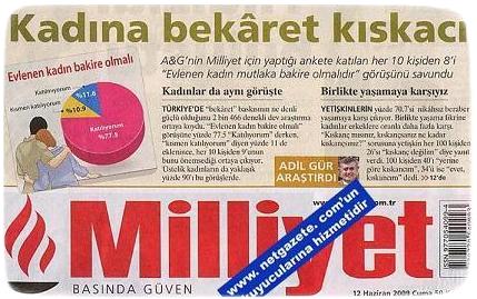 Bekaret tabu olmaktan ‘çıkıyor.’ Gazetelerin eş bulma sutünlarında evleneceği kişide kızlığın söz konusu olmadığını belirten erkekler giderek çoğalıyor. Namus kavramının düşünsel bir özellik olup anatomik yapılarla ölçülemeyeceği düşüncesi yaygınlaşıyor. (Hürriyet, 24.1.1980) Gençlerin bekâaret anlayışı ‘değişti.’ Buna göre, ODTÜ'deki kız öğrencilerin yüzde 96.3'ü ''bekaret ve namus arasında ilişki olmadığını'' belirtirken, yüzde 3.7'si ''kişi kendi iç huzuru için bekaretini korumalıdır, bu da namustur'' yorumunda bulundu. AÜ'deki kız öğrencilerin yüzde 70'i ''bekaret ve namus'' kavramlarını birbirinden ayırırken, yüzde 16'sı ''Bekaret namus için gereken şartlardan biridir'', yüzde 8'i ''Namus bekareti korumaktır'', 6'sı da ''Bekaret namustur'' anlayışına sahip. ''Bekaretin evliliğe saklanmasının gerekliliğine'' ilişkin soru üzerine ODTÜ'deki kız öğrencilerin yüzde 81.5'i bunun şart olmadığını belirtirken, yüzde 3.7'si ''gerekli'' yüzde 14.8'i de ''kesinlikle gerekli'' yanıtını veriyor. AÜ'deki kız öğrencilerin ise yüzde 2'si ''hiç gerekli değil'', yüzde 60'ı ''gerekli değil'', yüzde 6'sı ''gerekli'' ve yüzde 30'u ''kesinlikle gerekli'' yorumunu yapıyor. Öğrencilerin yüzde 2'si ise görüş bildirmek istemiyor. Aynı soru ''Evleneceğiniz kızın bakire olması gerekiyor mu?'' şekliyle erkek öğrencilere sorulduğunda ODTÜ'dekilerin yüzde 33.3'ü ''kesinlikle gerekli'', yüzde 7.4'ü ''gerekli'', yüzde 33.3'ü ''gerekli değil'', yüzde 26'sı ''hiç gerekli değil'' karşılığını veriyor. AÜ'dekilerin ise yüzde 50'si ''kesinlikle gerekli'', yüzde 2'si ''gerekli'', yüzde 48'i de ''gereksiz'' olduğuna inanıyor. (Hürriyet, 4.7.2002) Bekaret bir toplumsal ‘sorun.’ (Nokta Dergisi, 29 Eylül 1985, Yıl:3, Sayı:38) Kadına bekaret ‘kıskacı.’ A&G’nin Milliyet için yaptığı ankete katılan her 10 kişiden 8’i ‘Evlenen kadın mutlaka bakire olmalıdır’ görüşünü savundu. (Milliyet, 12.6.2009)
