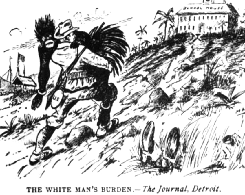 Victor Gillam, Judge dergisi, 1 Nisan 1899 tarihli "Beyaz Adamın Yükü" adlı bir karikatür yayınlar. Yükü taşıyan İngiltere ve ABD’dır! İşte Batı hem sömürmekte hem de ‘Barbarlık, baskı, ahlaksızlık’ gibi zorlukları aşarken, Batılı olmayan halkları (Küba, Hawaii, Samoa, Porto Riko, Filipinler, Zulu, Çin, Hindistan, Sudan ve Mısır) sırtlarında taşıyarak onları medenileştirme idealine götürdüklerini ileri sürmektedirler!